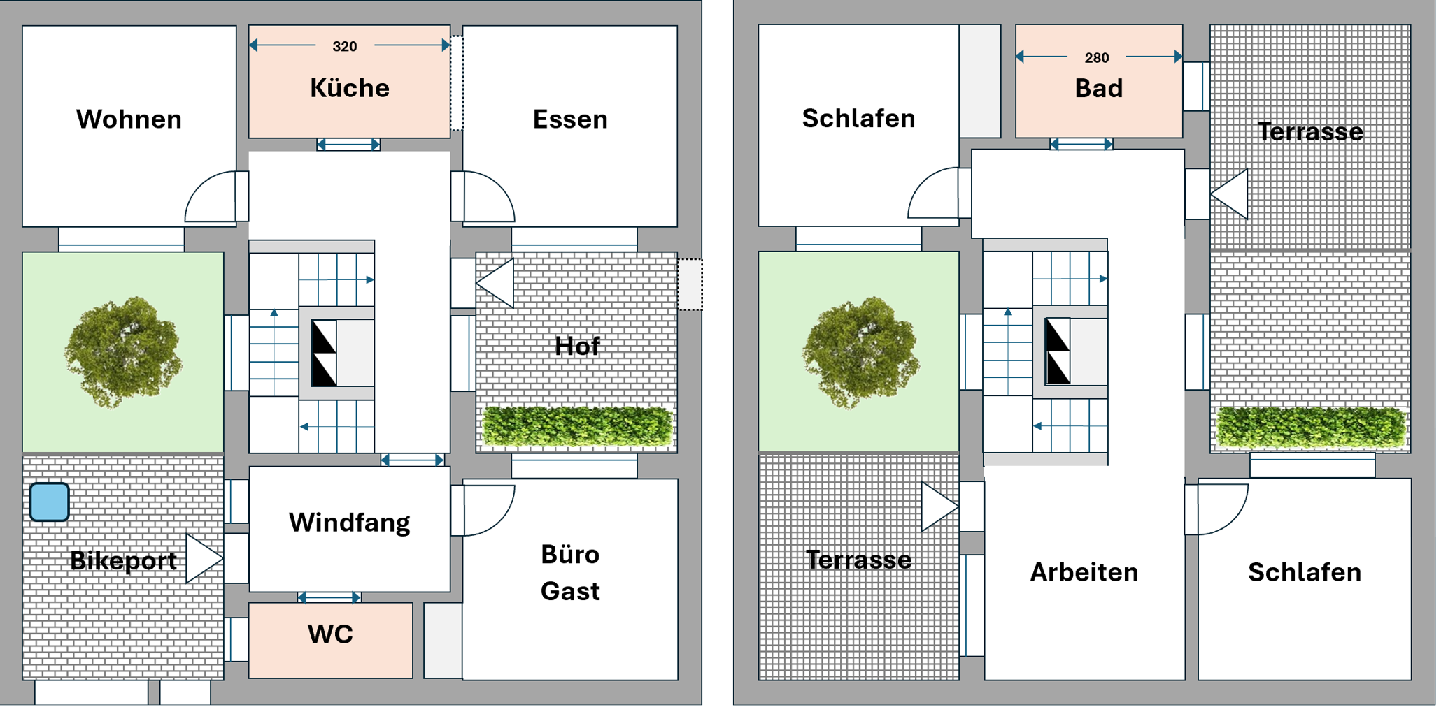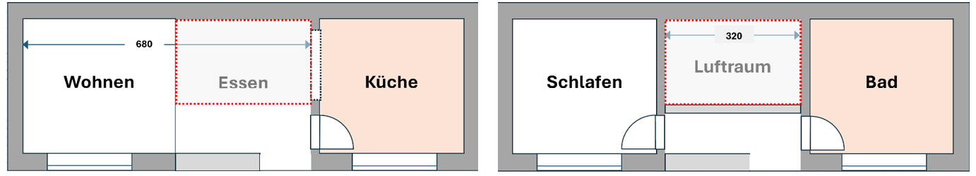 Im Erdgeschoß tauschen Küche und Esszimmer den Platz, wodurch sich der Wohnbereich vergrößert. Im Obergeschoss könnte dann das Bad auf die Terrasse rücken, was Platz für einen Luftraum über dem Essbereich schaffen würde.